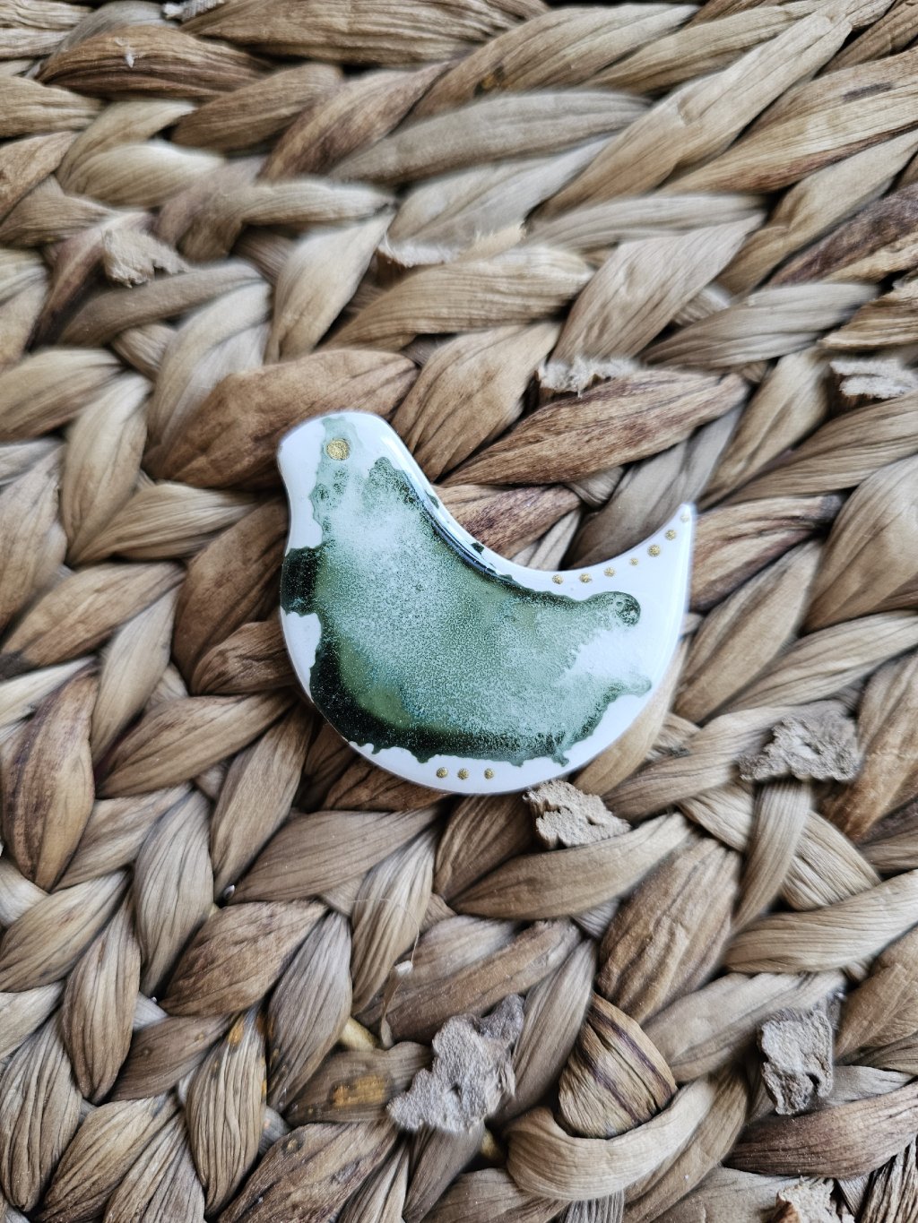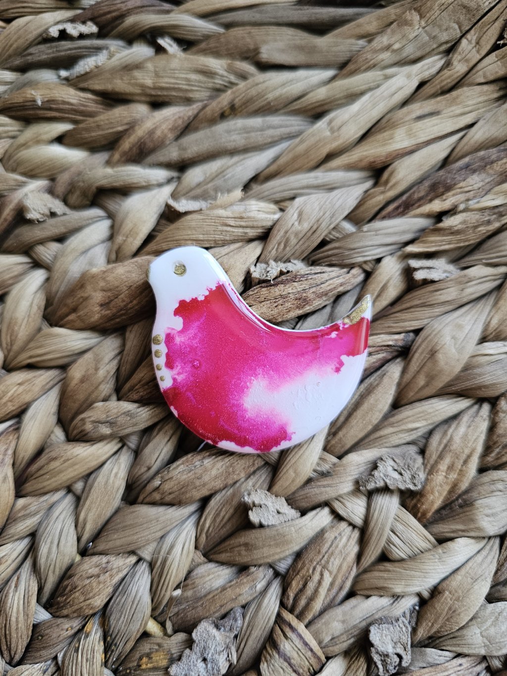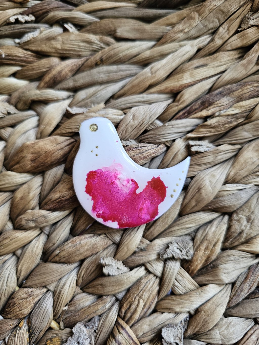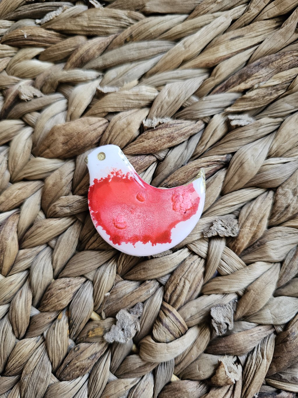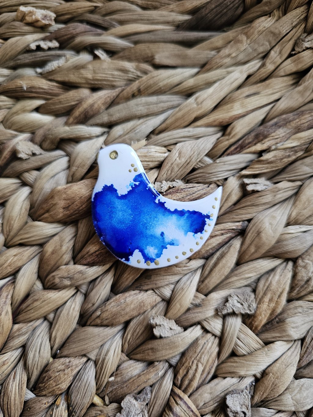 Brošňa je z kolekcie Abstrakt. Každý kúsok je jedinečný originál a to vďaka technike výroby. Sú vyrobené z polymérovej hmoty, ktorá je farbená alkoholovými farbami.  Povrch je zaliaty živicou, čo brošni dodáva krásny lesk. Zapínanie je bižutérny kov.