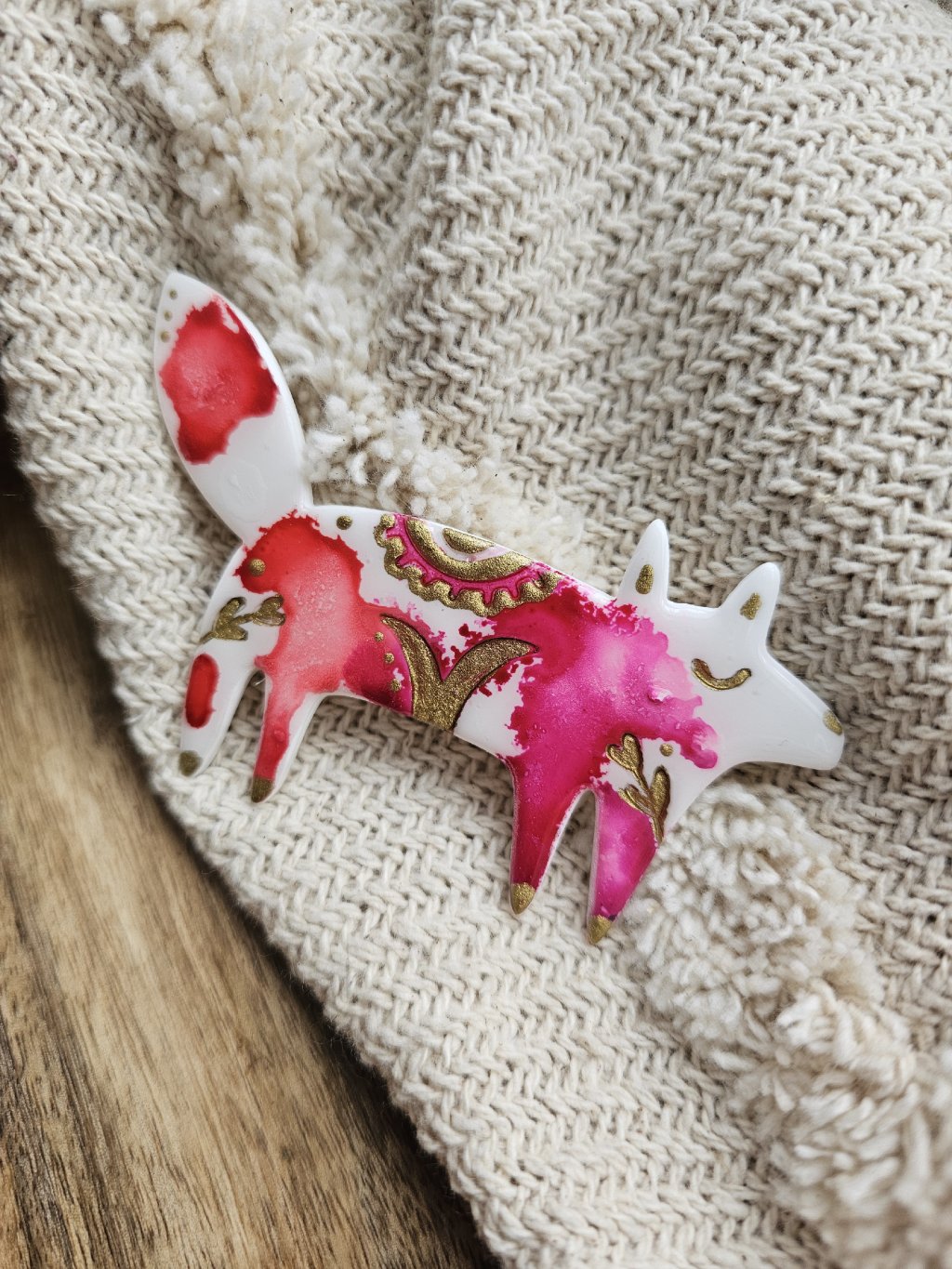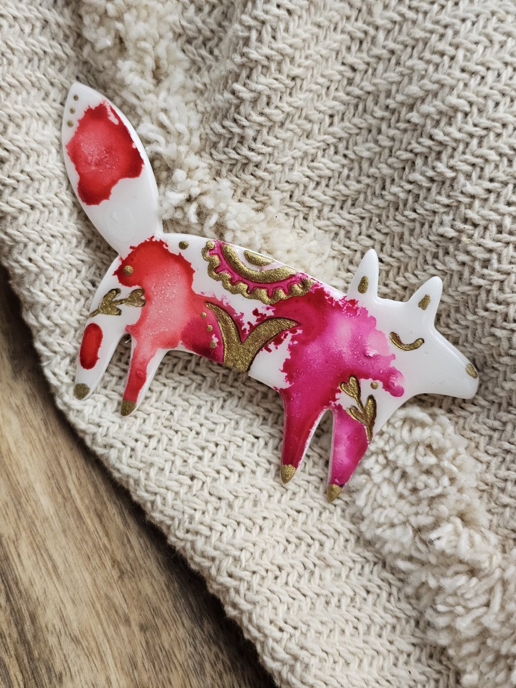 Brošňa je z kolekcie Abstrakt. Každý kúsok je jedinečný originál a to vďaka technike výroby. Sú vyrobené z polymérovej hmoty, ktorá je farbená alkoholovými farbami. Povrch je zaliaty živicou, čo brošni dodáva krásny lesk. Zapínanie je bižutérny kov.