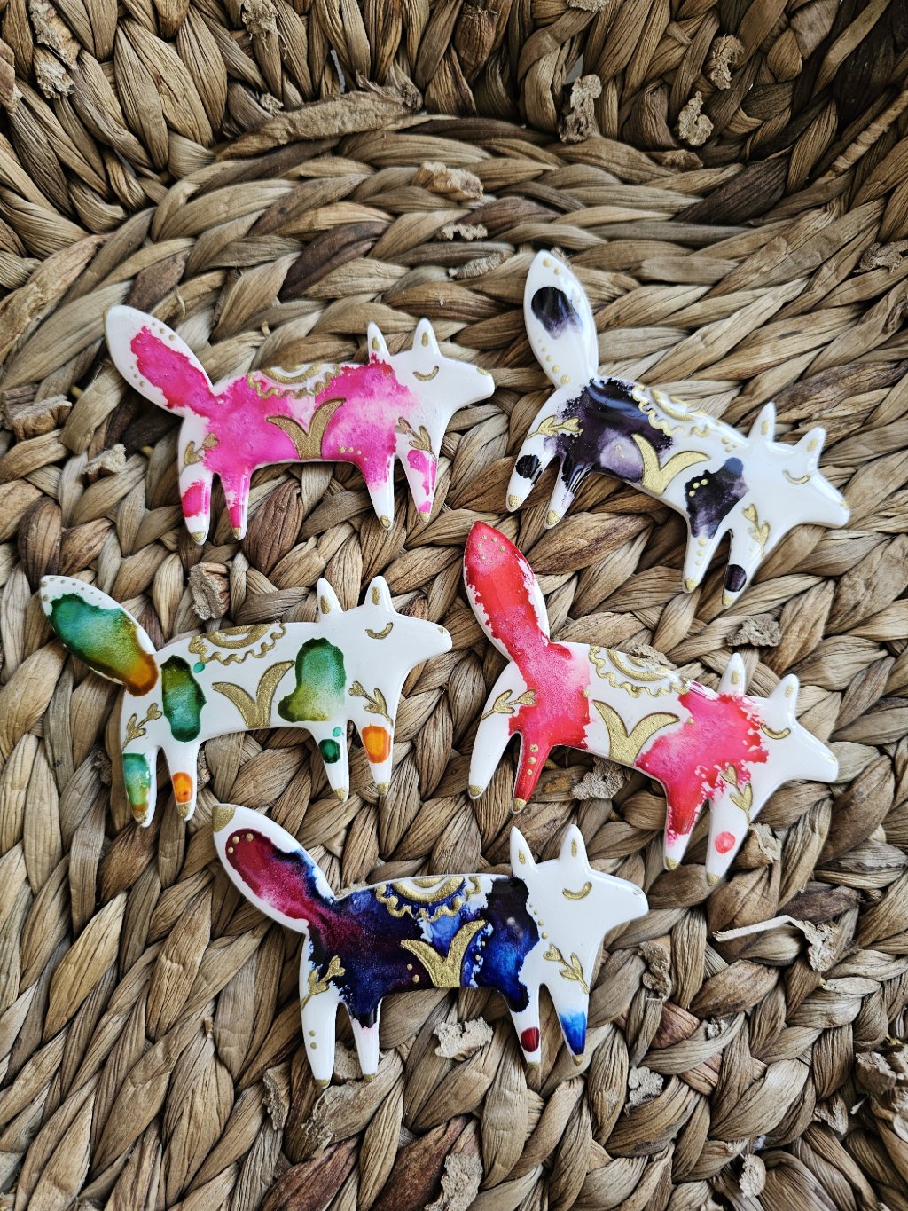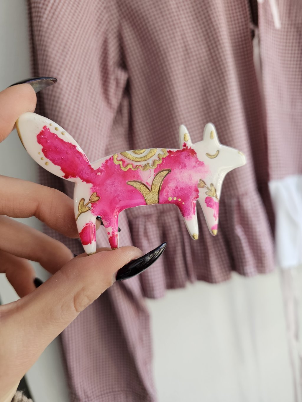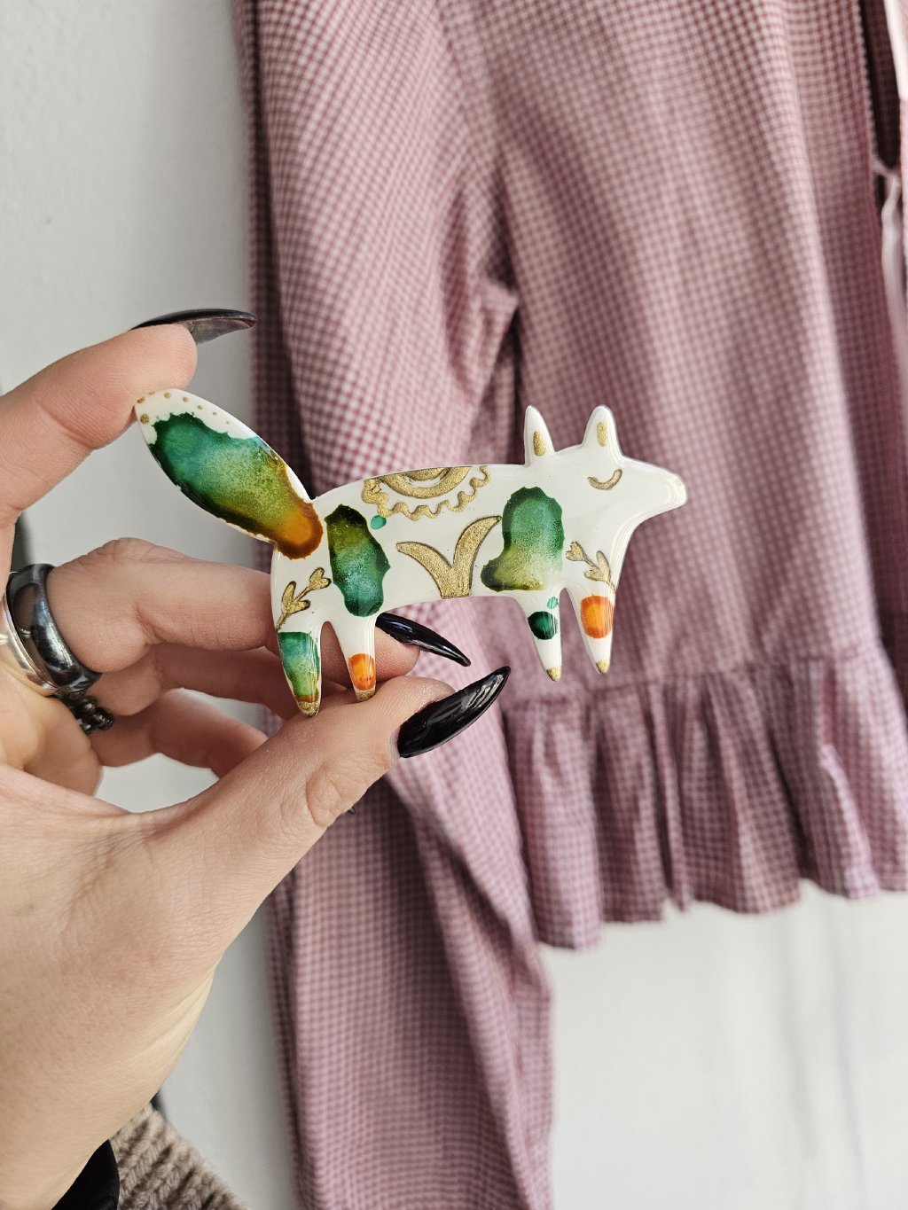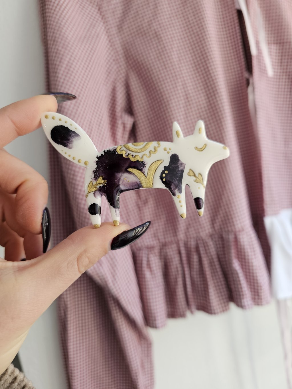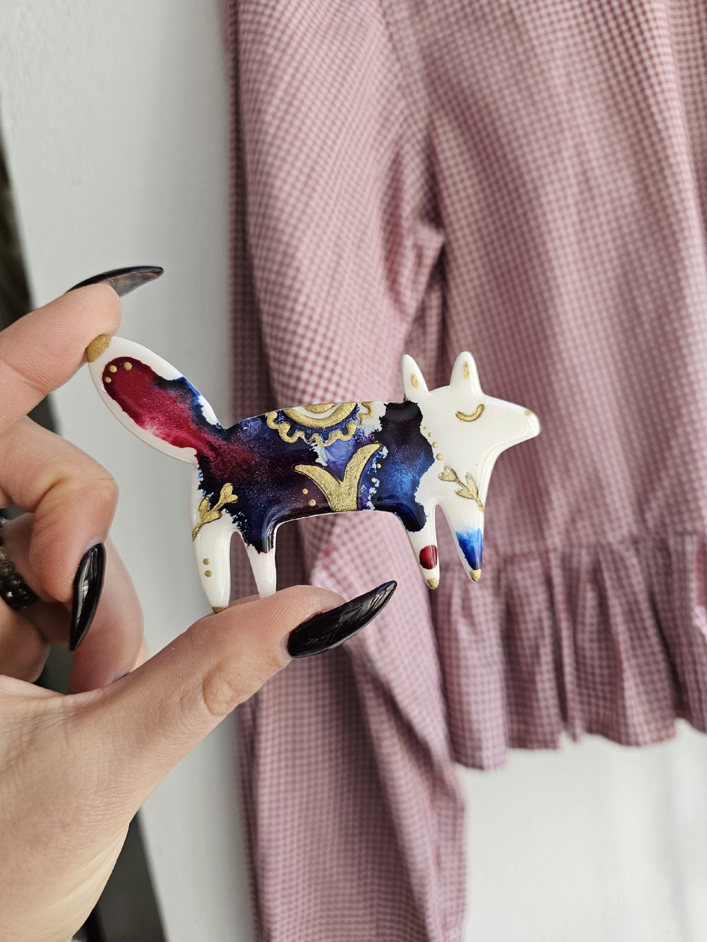 Brošňa je z kolekcie Abstrakt. Každý kúsok je jedinečný originál a to vďaka technike výroby. Sú vyrobené z polymérovej hmoty, ktorá je farbená alkoholovými farbami. Povrch je zaliaty živicou, čo brošni dodáva krásny lesk. Zapínanie je bižutérny kov.