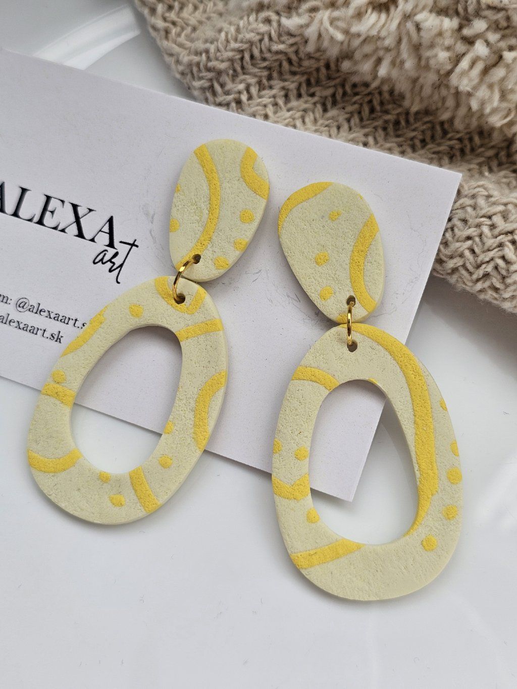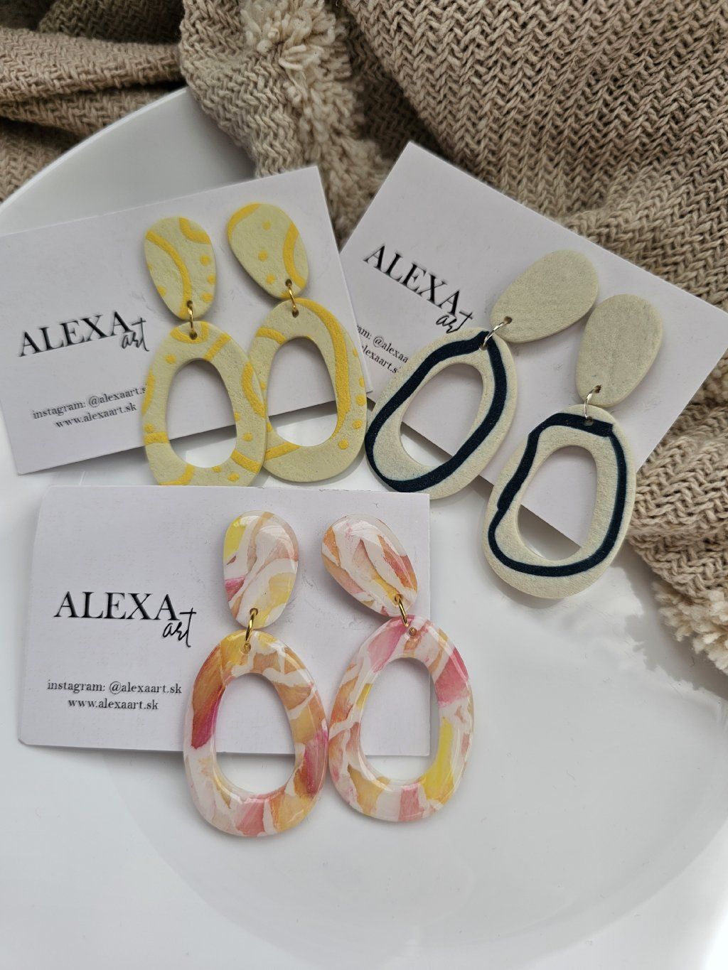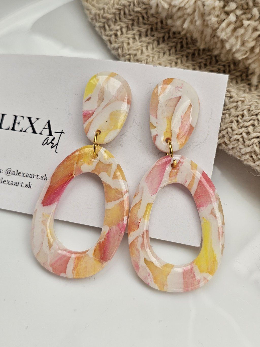 Každý kúsok je jedinečný originál, ručne vyrobený preto môže mať mierne odchýlky oproti fotografii. Sú vyrobené z polymérovej hmoty. Zapínanie je z chirurgickej ocele.