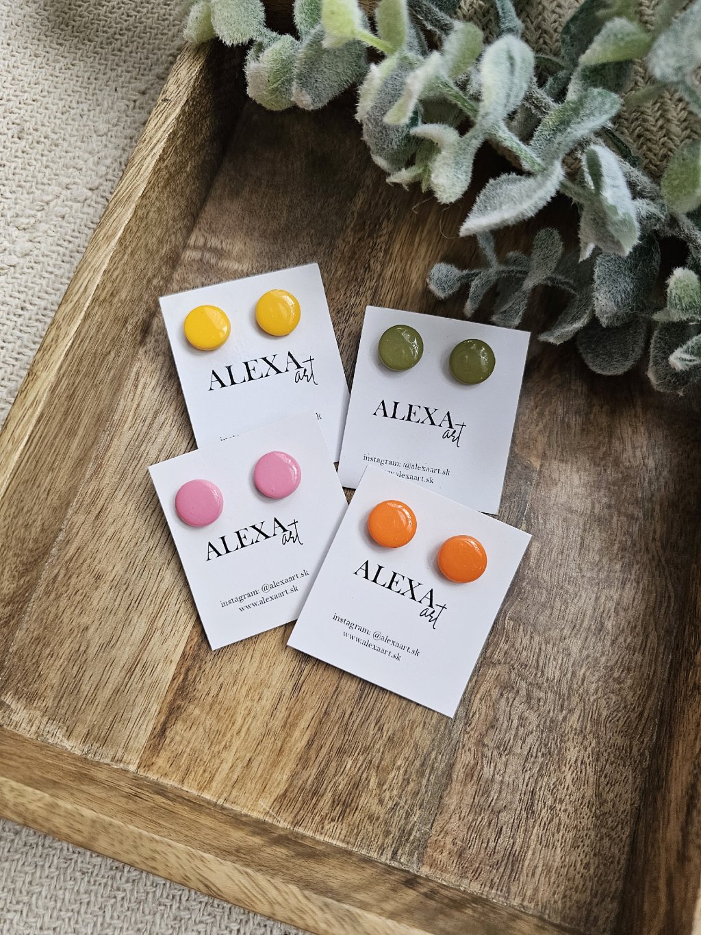 Náušnice sú z kolekcie Simple. Každý kúsok je jedinečný originál, ručne vyrobený preto môže mať mierne odchýlky oproti fotografii. Sú vyrobené z polymérovej hmoty. Zapínanie je z chirurgickej ocele.